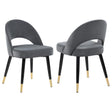 This set of two dining chairs features an elegant bucket style seat that lends a retro-inspired Mid Century modern look. Each chair offers long-lasting, supportive seats for each dinner guests, wrapped in faux leather upholstery that complements numerous color palettes and adds a bold statement piece. Flared, tapered legs further lend to the vintage flair. Gold capped feet offers a dramatic, regal Hollywood glam touch. Pull these chairs up to a spacious rectangular dining table to host a formal dinner or cocktail night.