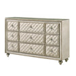 Our luxurious Lucienne dresser is designed to elevate your bedroom to the next level of sophistication and glamour. This stunning dresser is expertly crafted with attention to detail and quality. Upholstered in a luxurious beige velvet fabric, adding a touch of opulence and glamour to the overall design. Featuring quilted drawer fronts with crystal-like knobs. This dresser features nine drawers, offering even more storage space for all your clothing and accessories. The bun legs add a touch of classic elegance, creating a unique and sophisticated look that will enhance any decor.