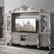 The Bently entertainment center is the perfect centerpiece for your media room. Gorgeous carved floral motifs and over-sized Queen Anne legs grace each part of this set. The TV stand easily accommodates a 70-inch panel TV. Coupled with the side piers, you'll have provide plenty of storage space for organization or display. A lavish carving crowns the lighted center bridge to emphasize the glory of this elegant, champagne-colored entertainment set.