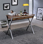 Combining chrome "X" legs and beautifully finished wood, the Callers desk is statement piece as well as a functional desk. It comes with 2 drawers that follow the front angle created by the "X" design of the sides. It is a wonderful pairing of hard lines and warm wood tone.