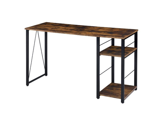 Personfiy your workpalce with some bold,clear and strong accessories. The distressed wood furniture piece pairs with metal framing for aesthetic balance and gives a rustic industrial look. It includes two open shelves for additional storage space and the lower shelf featuring large space is great for a computer box. The Vadna Desk will set the tone for the whole space.