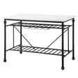 Give off a light and airy feel to a compact cooking space. The Mera Kitchen Island features a artificial stone top paired with a metal slatted shelves, creating a sleek, timeless silhouette that bring your kitchen an open feel. Bottle rack and wine glass storages keep your glassware and collection within reach. Use this stylish yet functional addition to complete your kitchen decor.
