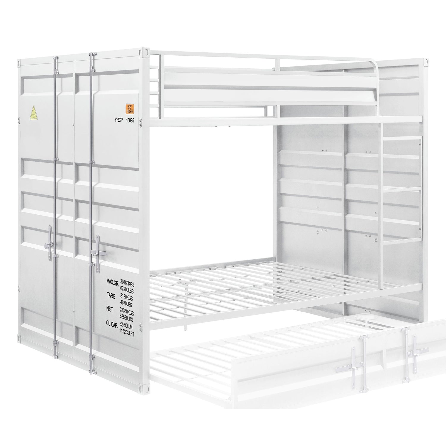 The Cargo bunk bed and trundle is the perfect addition to any child's room. This contemporary container themed metal bunk bed is crafted with an industrial look that is an ideal addition to your bedroom. The bed is accented with recessed panel design and locks in an understated finish. This fashionable bed will accent your other bedroom furniture, transforming a room from ordinary into something playful and unique.