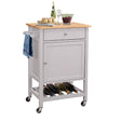 The Hoogzen Kitchen cart is perfect for adding additional work space and storage to your kitchen area. The cart features a side towel bar, one storage drawer, an open bottom shelf and one spacious closed door cabinet space. Easy roll casters provide for easy mobility around your room. The finish is perfectly accented with modern styled silver pulls and a natural wood top. Some Assembly Required.
