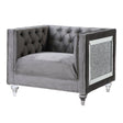 Impressive and bold, the Heiberoll living room collection is sure to impress your guests. The set includes mirrored side trim with faux diamonds to add a glimmering touch. The whimsical acrylic turned legs give off the illusion that the pieces are floating. The collection is upholstered in a plush velvet that feels silken to the touch. Ultra-comfortable seats and a sturdy wooden inner frame make this piece a joy to lounge on. Classic nailhead trim and button tufting finish off this glamorous set. Available in two colors pink and gray.