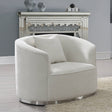 Unwind and rest when seated on this luxurious beige chenille Odette chair. This lovely chair is just the thing to inject drama into your living space. The plush seating offers countless hours of relaxation. The unique barrel shape immediately commands attention, and the brushed chrome stainless steel detailing finishes off the base in contemporary panache.