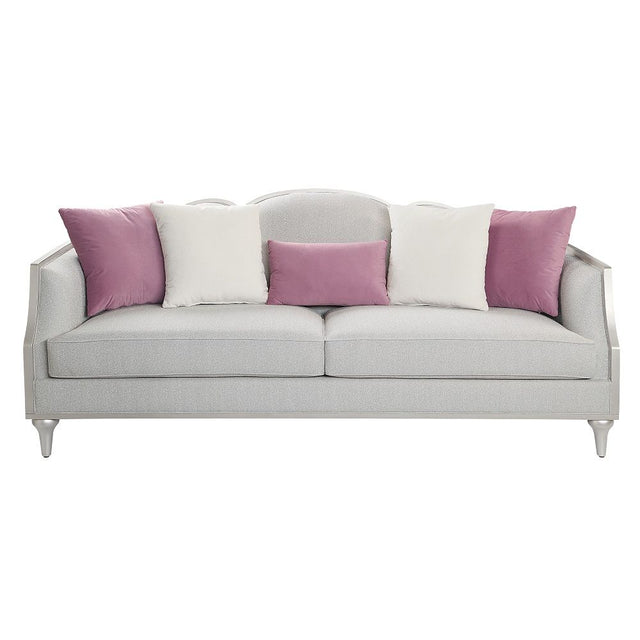 Outlined with wooden trim for a traditional cabriole silhouette with a camel back backrest feature, the Kasa sofa is for those that seek a classic design. The beige linen fabric is soft to the touch and perfectly contrasts with the champagne wooden finish. This sofa is a modern take on the French-traditional style. Five throw pillows in varying colors and sizes are included.