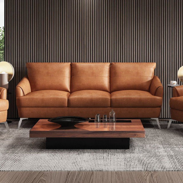 The Safi sofa is upholstered in a cappuccino finish leather and constructed with a sturdy, wooden inner frame under its dense full-foam cushioning. This mid-century inspired sofa seats up to three of your favorite people. The chrome finish featured on its metal legs, coupled with plush heavy-duty back suspension for hours of comfortable lounging.