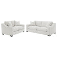 This sophisticated sofa set blends sculptural curves with plush, supportive comfort. Curved track arms define each silhouette, while reversible cushions filled with down-like fiber and supported by pocket coils ensure softness and structure. A sinuous spring deck rests over a solid wood frame for enduring durability. Wrapped in textured fabric upholstery, each piece includes accent pillows that elevate the lounging experience with cozy elegance.