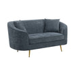 Spark memorable conversations with the sublime curved back Nakendra loveseat. Finely upholstered in soft, cobalt blue chenille and generously padded in dense foam, creating a premium seating experience for you and your guests. This tailored statement piece is perfect for the modern living room, entryway, lounge area, or bedroom. Doubling as an settee for your extra seating needs in your home or apartment, sublime comes positioned on four tapered and Splayed gold metal legs with non-marking foot caps.
