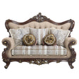 Embrace the essence of lavish living into your home with this Ragnar sofa. Highlighting detailed carvings that naturally follow with the elegant curves of the rolled arms that make a transition to the wood-trimmed arched backrest which features a camel hump wooden frame silhouette. The front legs and the front apron boast beautiful carved detail. Sit in comfort on the pocket coil seating and the included 7-throw pillows.