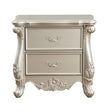 Create the bedroom of your dreams with our Bently nightstand, which includes a magnificent frame that is adorned with stunning floral and scrolled details. This nightstand features two ample drawers that will make it convenient for you to keep bedtime essentials within arm's reach. The glides ensure that the drawers open and close smoothly. The beautiful, scalloped edges add refinement and visual interest, and the scroll legs are beautiful and sturdy. The champagne finish is rich and sophisticated.