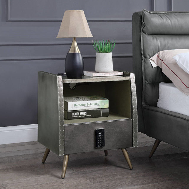 Doris - Nightstand With USB & Electric Lock - Gray Top Grain Leather & Aluminum