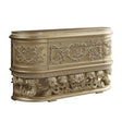 The Vatican Dining Room Collection brings dreamy romantic accents in classic design into your traditional dining room. Intricate trim features vigorous curves of scrolling vines and floral elements, while a champagne gold finish adds a touch of opulence and sophistication. The collection boasts glass dining table top and curio doors that reflect the light back into the dining area for an airier and lighter vibe. Deeply inviting, the matching dining chairs offer button tufted back and padded seat. Treat your guests to lavish warmth and comfort with the Vatican Dining Room Collection.