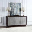 Our Geranio console cabinet has artfully scored antiqued metallic silver door fronts that are etched in an abstract design. The cabinet with its walnut finish illustrates the talent of our design team in achieving such a refined sense of texture on a metal surface. Behind the doors is one fixed shelf; the center portion features a media cable management cut-out making it easier to keep media consoles hidden when not in use.