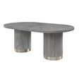 This Adalynn dining table brings a sleek, spacious surface to your dining room. This table stands on a double pillar base with silver metal tips for a stylish touch. Finished in a weathered gray oak that showcases a tabletop with light wooden grains. This table features a textured oval surface with rounded corners for a sculptural silhouette. Adding to the overall allure of the design gives the piece a modern flare.