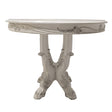 This stunning Dresden counter-height round dining table showcases a bone-white finish that exudes elegance and sophistication. The table features a classic wooden tabletop with a delicately detailed apron. Adding to its allure, the table is supported by claw feet that form a single pedestal that evokes a sense of timeless charm. The intricately carved pedestal resembles the claws of a majestic creature, adding a touch of drama and sophistication to the table's design. With its round shape, this table encourages conversation and a sense of togetherness, making it perfect for intimate gatherings. Its compact design allows it to fit seamlessly into smaller dining spaces while still providing ample tabletop surface for dining and entertaining.