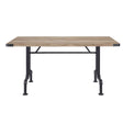 Featuring a rectangular wooden tabletop in an oak finish the Edina dining table merges farmhouse and industrial elements for the ideal dining table for the modern home. Metal corner protectors with rivets that elevate the tabletop. The metal pipe trestle base provides strength and durability and completes the industrial look.