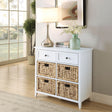 Get exceptional value on this transitional Filbert chest. Featuring a rich finish, the drawers and open compartment spaces give plenty of room for storage. The table looks great with or without the included wicker crate baskets. Some Assembly Required.