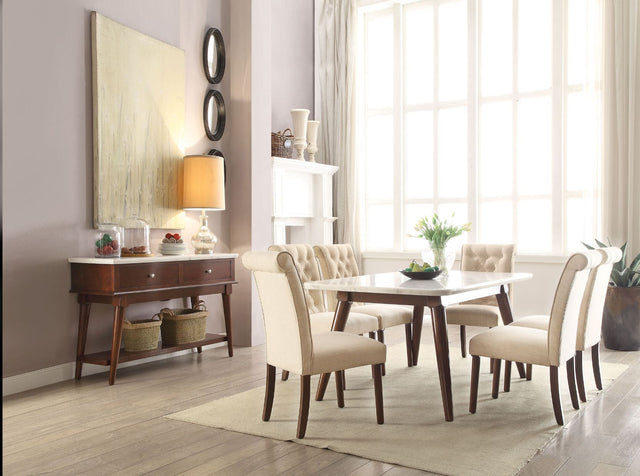 Spacious seating space accented with an eye-catching marble table top and wooden tapered base, the Gasha dining collection will be the most attractive addition to any home. To add more comfort, the side chairs are upholstered in beige linen. Also, take the matching server home to complete the unique look and maximize the functions of the set.
