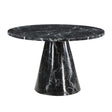 Round out your dining room with the Hollis dining collection. With an emphasis on clean lines and simple design, this circular pedestal dining table creates a crisp minimalist look in your home. Crafted from engineered stone, it features a rounded tabletop that's set on a conical pedestal base. The base tapers into a cylinder at the neck for visual dimension. The gray velvet dining chairs are minimal in design and allow the table to pop. This table set holds up to daily use, at 48'' in diameter, it is sized to seat up to four people.