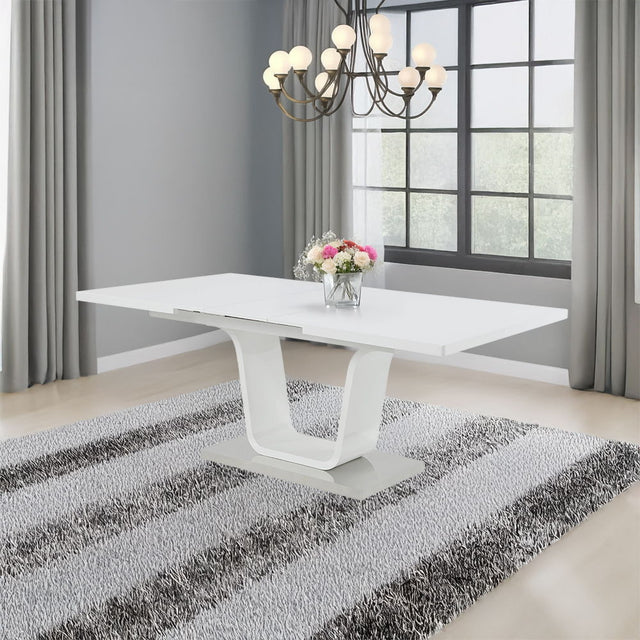 This Kamaile dining table is modern and stylish, and the smooth white high gloss is inviting in any dining space. The extending dining table features a beautiful chrome base with an open U-shaped pedestal and is complimented by a wooden top. The tabletop can be easily expanded to accommodate additional dining guests.