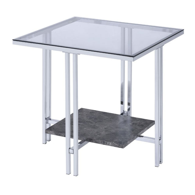 KD, Rectangular End Table • Storage: Open Compartment (1 Wooden Shelf, Fixed) • Features: Glass Top, Faux Marble Shelf, Metal Leg Base (Open Base) •• CONSTRUCTION •• TOP) GLASS: 5mm (NO Apron) • SHELF) Faux Marble: Paper Veneer, PB () • BASE) Metal Straight Leg: Chrome Finish, Metal Tube