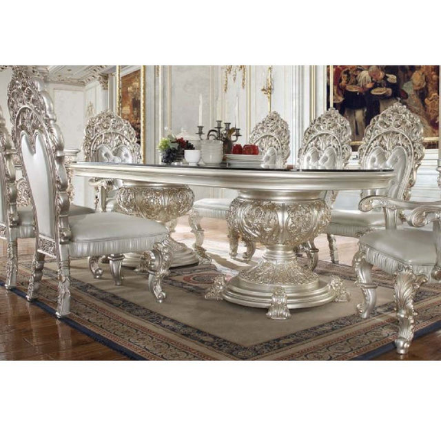 Introducing the extraordinary Sandoval dining table that exudes elegance and craftsmanship. This dining table features a unique design with a clear glass tabletop overlaying a wooden tabletop, allowing the exquisite carvings on the wooden surface to be beautifully showcased. The double pedestal base, adorned with intricate carvings, adds a touch of grandeur to this remarkable piece. All these remarkable features are enhanced by the luxurious champagne finish. The champagne finish adds a touch of glamour and refinement, elevating the dining table to a statement piece that transforms any dining area into a luxurious setting. Indulge in the beauty of this exquisite dining table, that will create a captivating and luxurious focal point for your dining space.
