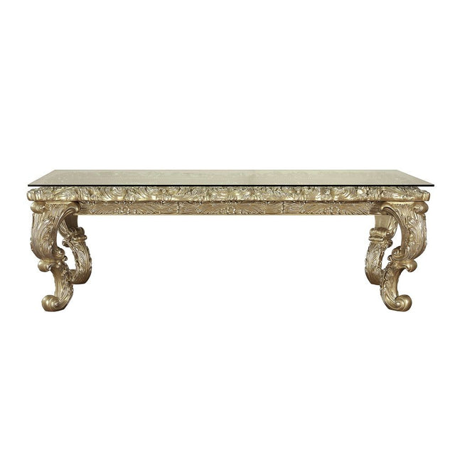 The Vatican Dining Room Collection brings dreamy romantic accents in classic design into your traditional dining room. Intricate trim features vigorous curves of scrolling vines and floral elements, while a champagne gold finish adds a touch of opulence and sophistication. The collection boasts glass dining table top and curio doors that reflect the light back into the dining area for an airier and lighter vibe. Deeply inviting, the matching dining chairs offer button tufted back and padded seat. Treat your guests to lavish warmth and comfort with the Vatican Dining Room Collection.