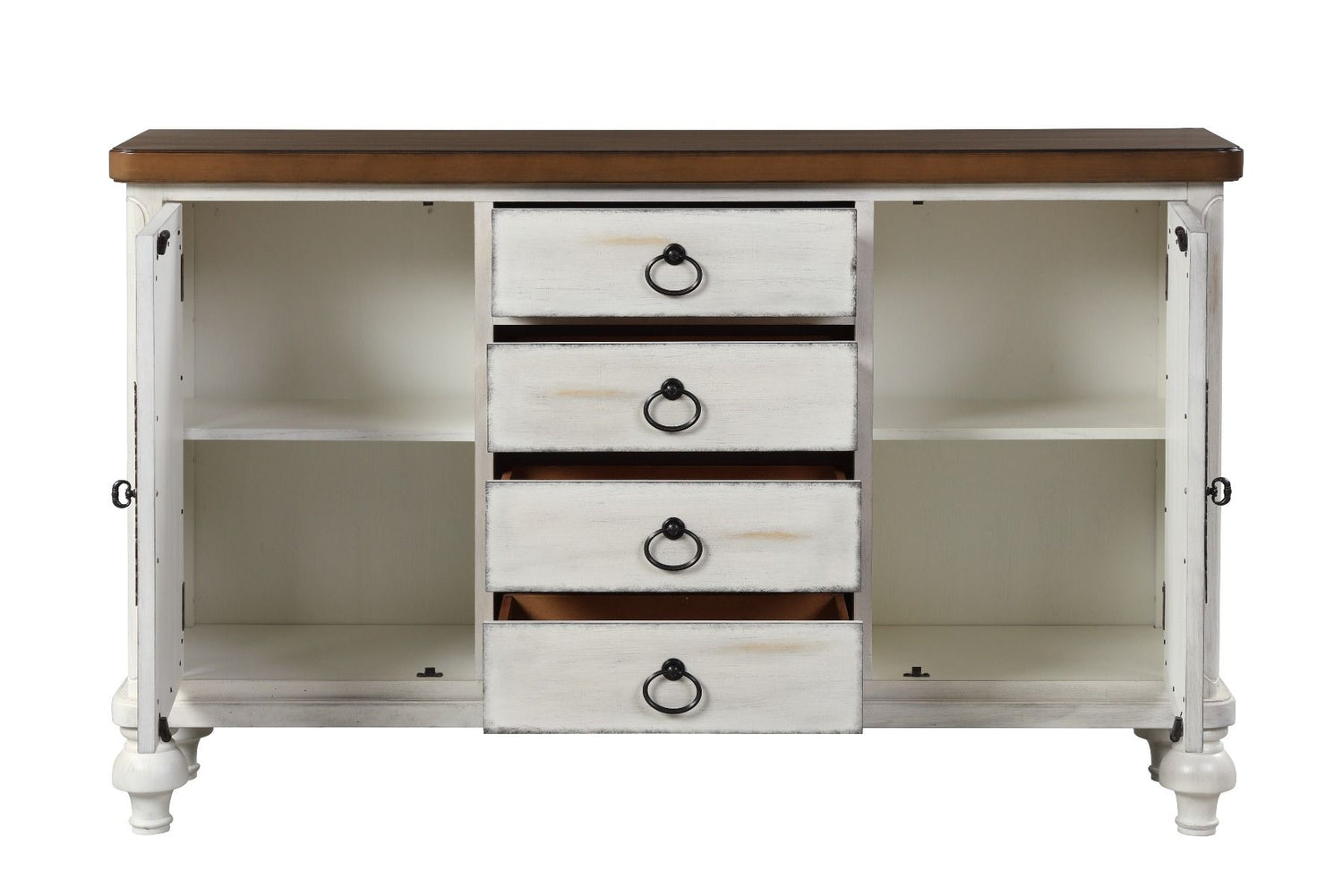 The elegant Vernon Console Table features an antique white finish with decorative cabinet door inlays. The rectangular wood console table features 4 center drawers and 2 doors on each end that reveal 4 additional shelves, providing ample display and additional storage space. The modern style cabinet in antique white with decorative cabinet doors and bun legs will add a stylish accent to every room in your home. Whichever room you choose to use the Vernon in its style will not only blend masterfully but is sure to be the conversation piece.