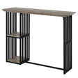 Introducing the captivating Zudora counter height table that seamlessly blends antique and industrial styles, resulting in a stunning centerpiece for your dining area. The antique oak tabletop exudes warmth and timeless beauty, its rich and inviting tones create a charming and rustic atmosphere, making it a perfect choice for those seeking a vintage-inspired aesthetic. Contrasting against the antique oak tabletop is a sleek black finish slatted metal base. This industrial-style base adds a contemporary touch to the table's overall design, creating an eye-catching contrast between the warm wood and the cool metal. The slatted metal construction not only enhances the table's visual appeal but also ensures durability and stability. To further enhance its functionality, this counter height table features two open shelves. These shelves provide convenient storage and display space for items such as dishes, glassware, or decorative accents. Whether you want to showcase your favorite pieces or keep essential items within reach, the open shelves offer versatility and practicality. The counter height design of the table adds a pub-style element, creating a casual and relaxed atmosphere for dining or entertaining.